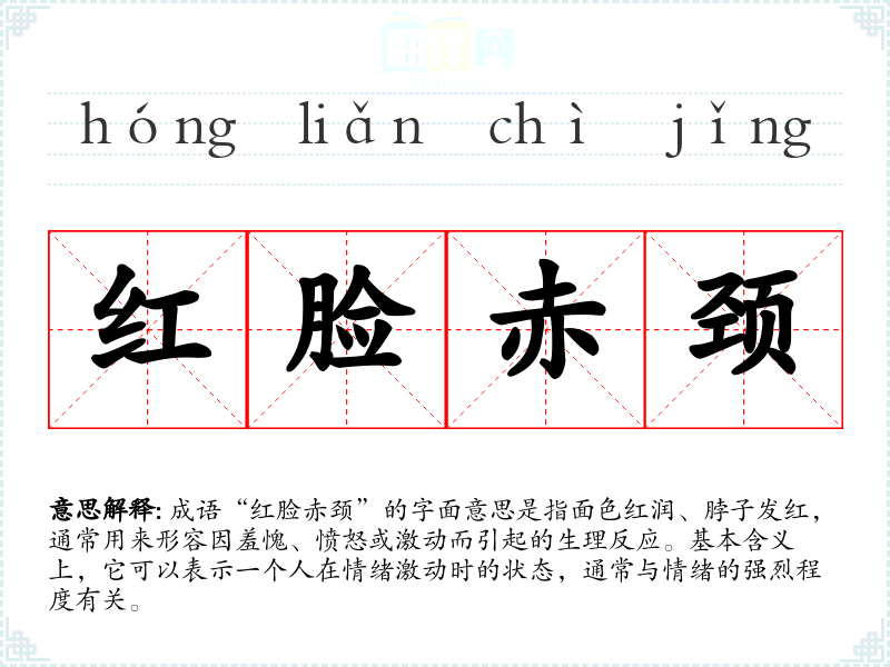 成语“红脸赤颈”的字面意思是指面色红润、脖子发红,通常用来形容因羞愧、愤怒或激动而引起的生理反应。基本含义上,它可以表示一个人在情绪激动时的状态,通常与情绪的强烈程度有关。