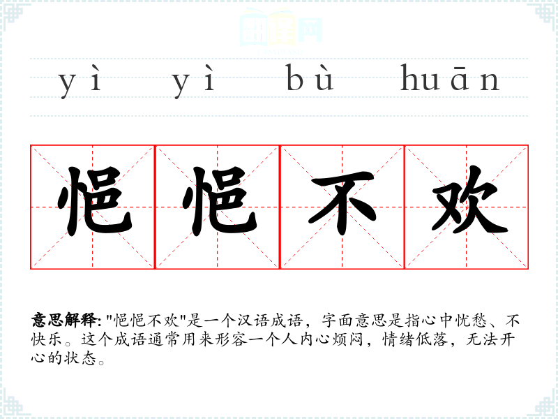 "悒悒不欢"是一个汉语成语,字面意思是指心中忧愁、不快乐。这个成语通常用来形容一个人内心烦闷,情绪低落,无法开心的状态。