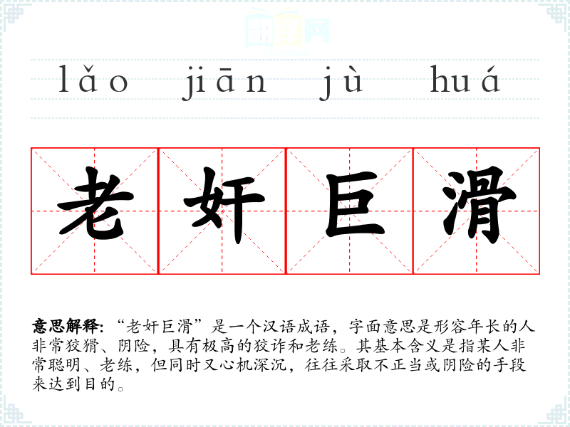 “老奸巨滑”是一个汉语成语,字面意思是形容年长的人非常狡猾、阴险,具有极高的狡诈和老练。其基本含义是指某人非常聪明、老练,但同时又心机深沉,往往采取不正当或阴险的手段来达到目的。
