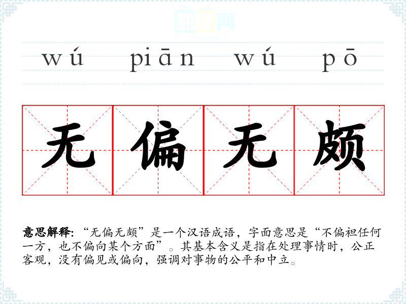 “无偏无颇”是一个汉语成语,字面意思是“不偏袒任何一方,也不偏向某个方面”。其基本含义是指在处理事情时,公正客观,没有偏见或偏向,强调对事物的公平和中立。