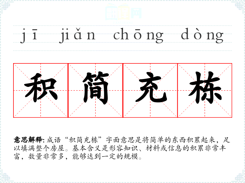 成语“积简充栋”字面意思是将简单的东西积累起来,足以填满整个房屋。基本含义是形容知识、材料或信息的积累非常丰富,数量非常多,能够达到一定的规模。