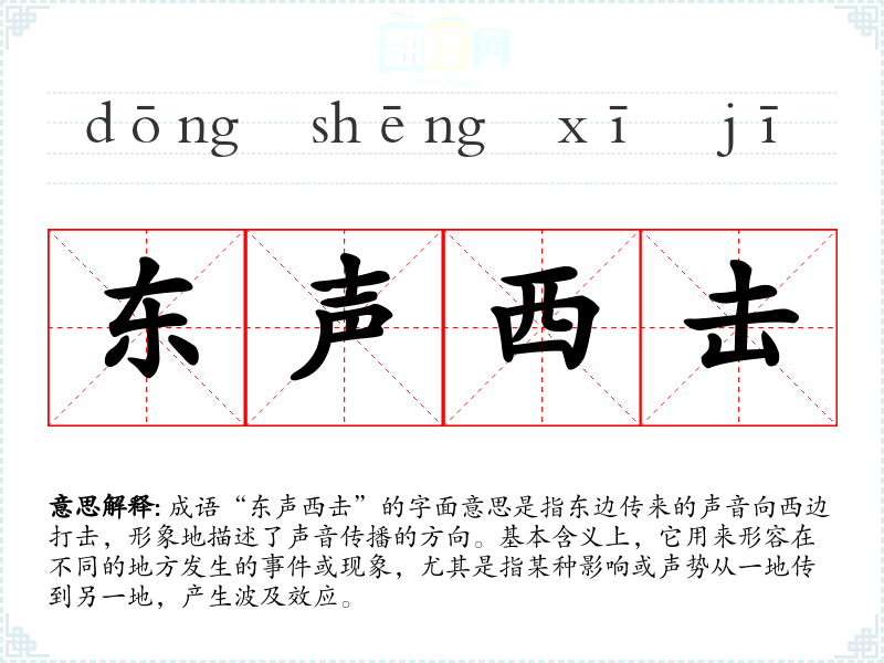 成语“东声西击”的字面意思是指东边传来的声音向西边打击,形象地描述了声音传播的方向。基本含义上,它用来形容在不同的地方发生的**或现象,尤其是指某种影响或声势从一地传到另一地,产生波及效应。