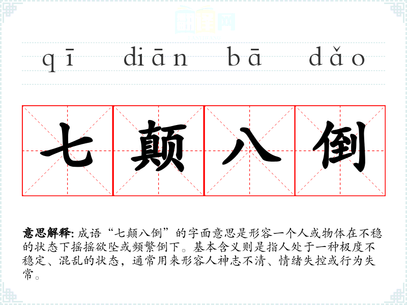 成语“七颠八倒”的字面意思是形容一个人或物体在不稳的状态下摇摇欲坠或频繁倒下。基本含义则是指人处于一种极度不稳定、混乱的状态,通常用来形容人神志不清、情绪失控或行为失常。