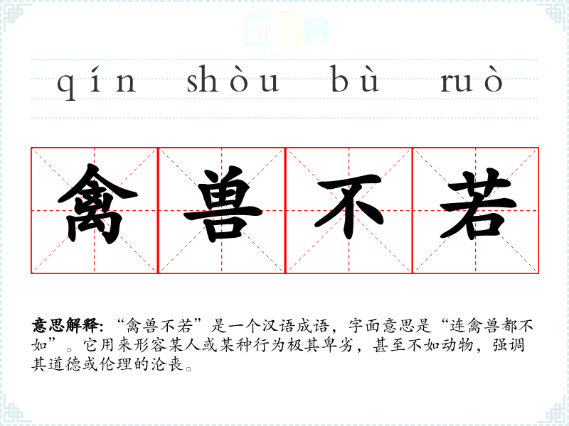 “禽兽不若”是一个汉语成语,字面意思是“连禽兽都不如”。它用来形容某人或某种行为极其卑劣,甚至不如动物,强调其道德或伦理的沦丧。