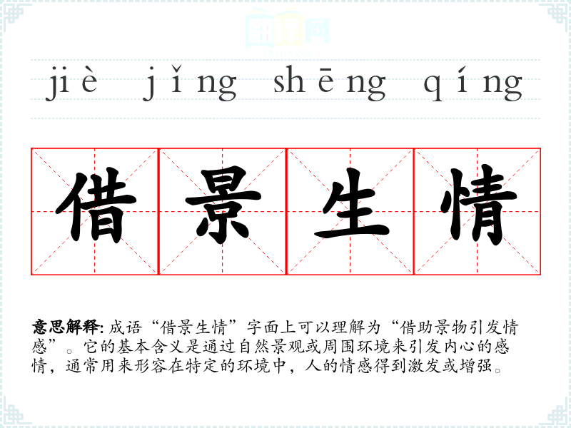成语“借景生情”字面上可以理解为“借助景物引发情感”。它的基本含义是通过自然景观或周围环境来引发内心的感情,通常用来形容在特定的环境中,人的情感得到激发或增强。
