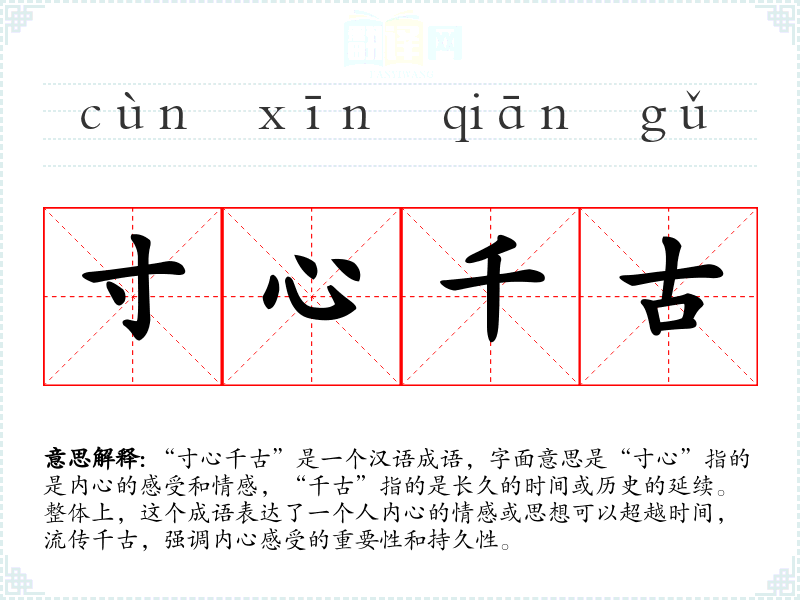 “寸心千古”是一个汉语成语,字面意思是“寸心”指的是内心的感受和情感,“千古”指的是长久的时间或历史的延续。整体上,这个成语表达了一个人内心的情感或思想可以超越时间,流传千古,强调内心感受的重要性和持久性。