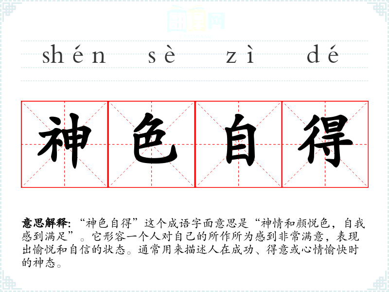 “神色自得”这个成语字面意思是“神情和颜悦色,自我感到满足”。它形容一个人对自己的所作所为感到非常满意,表现出愉悦和自信的状态。通常用来描述人在成功、得意或心情愉快时的神态。