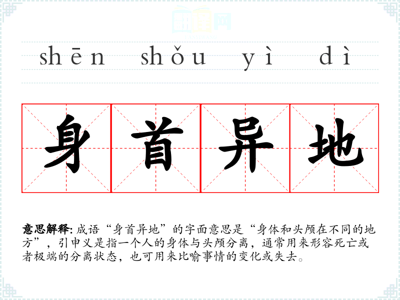 成语“身首异地”的字面意思是“身体和头颅在不同的地方”,引申义是指一个人的身体与头颅分离,通常用来形容死亡或者极端的分离状态,也可用来比喻事情的变化或失去。