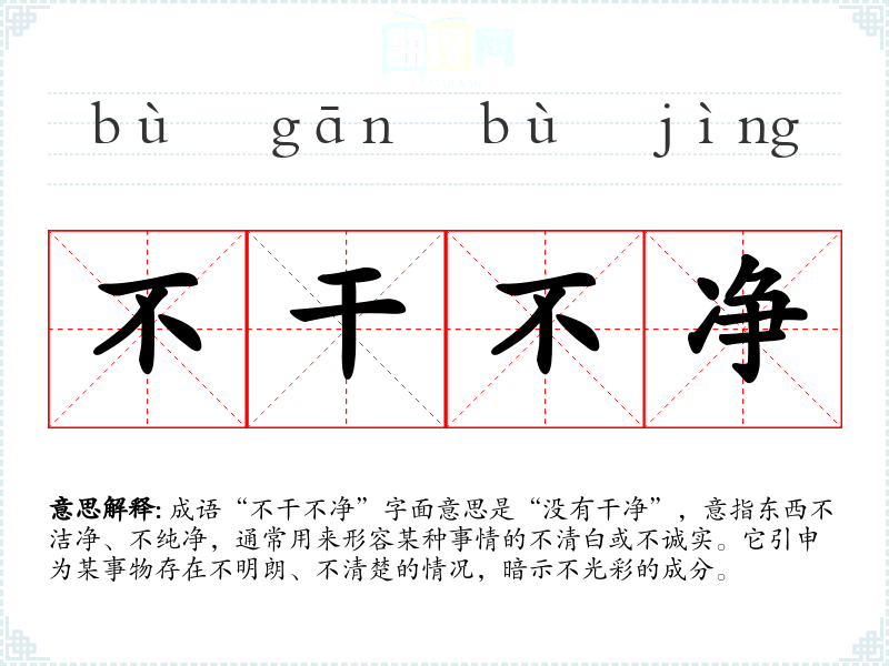 成语“不干不净”字面意思是“没有干净”,意指东西不洁净、不纯净,通常用来形容某种事情的不清白或不诚实。它引申为某事物存在不明朗、不清楚的情况,暗示不光彩的成分。
