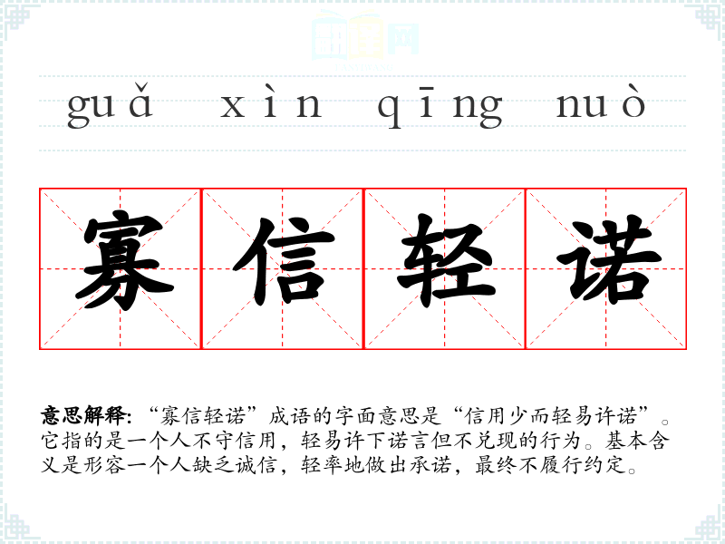 “寡信轻诺”成语的字面意思是“信用少而轻易许诺”。它指的是一个人不守信用,轻易许下诺言但不兑现的行为。基本含义是形容一个人缺乏诚信,轻率地做出承诺,最终不履行约定。
