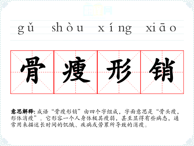 “骨瘦形销”的出处较为模糊,但其表达的意思与古代文学中的描写相近。在古典诗词中,常有对人瘦弱景象的描写,如《红楼梦》中对贾宝玉的身体状况有类似的描绘。该成语反映了古代社会对身体健康的重视,尤其是在饥荒或战争时期,瘦弱的身影常常成为文学作品中的常见主题。