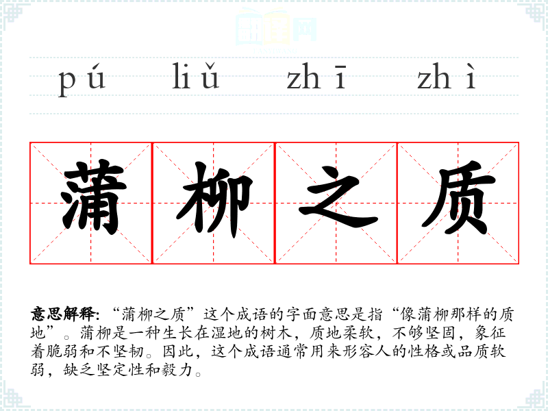 “蒲柳之质”这个成语的字面意思是指“像蒲柳那样的质地”。蒲柳是一种生长在湿地的树木,质地柔软,不够坚固,象征着脆弱和不坚韧。因此,这个成语通常用来形容人的性格或品质软弱,缺乏坚定性和毅力。