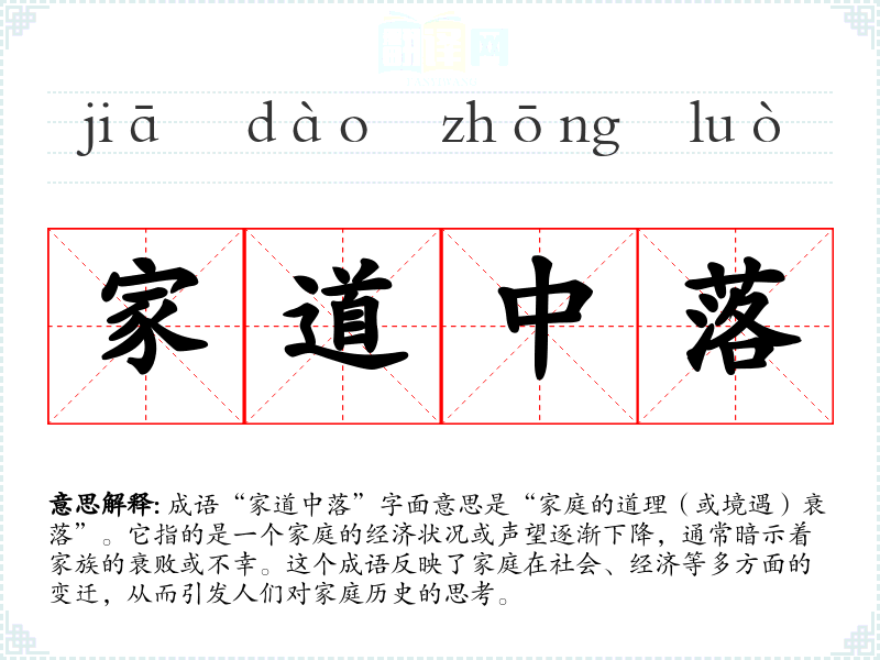 成语“家道中落”字面意思是“家庭的道理(或境遇)衰落”。它指的是一个家庭的经济状况或声望逐渐下降,通常暗示着家族的衰败或不幸。这个成语反映了家庭在社会、经济等多方面的变迁,从而引发人们对家庭历史的思考。