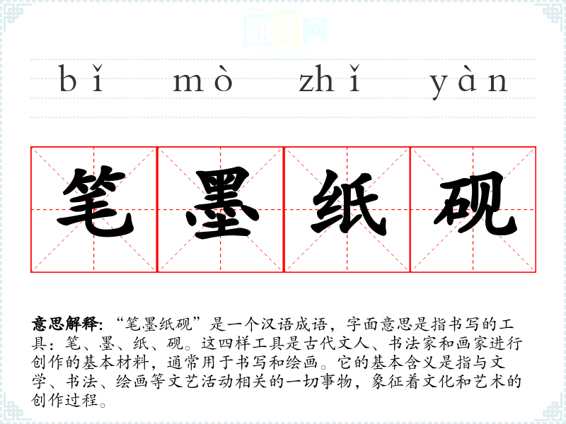 “笔墨纸砚”是一个汉语成语,字面意思是指书写的工具:笔、墨、纸、砚。这四样工具是古代文人、书法家和画家进行创作的基本材料,通常用于书写和绘画。它的基本含义是指与文学、书法、绘画等文艺活动相关的一切事物,象征着文化和艺术的创作过程。