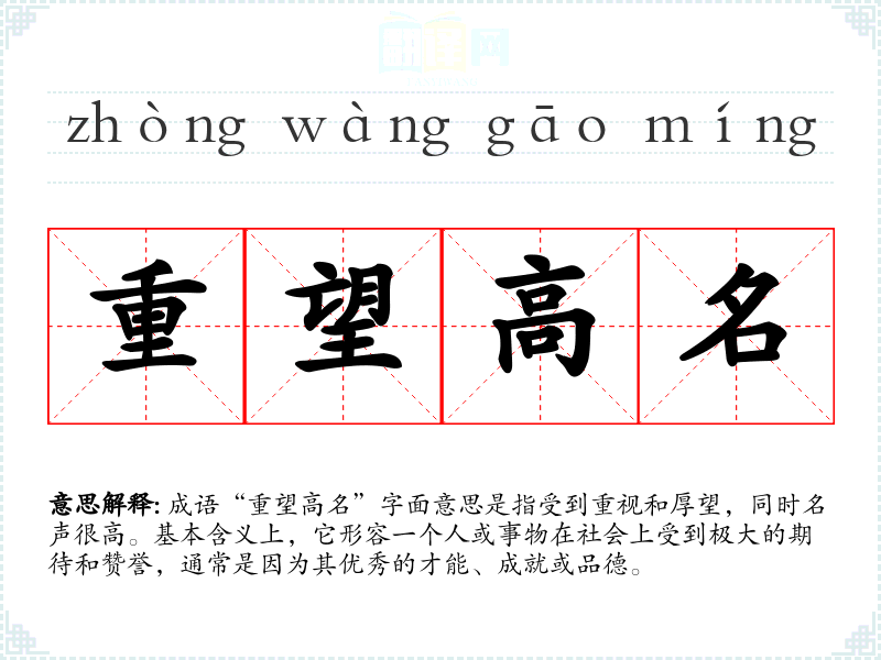 成语“重望高名”字面意思是指受到重视和厚望,同时名声很高。基本含义上,它形容一个人或事物在社会上受到极大的期待和赞誉,通常是因为其优秀的才能、成就或品德。
