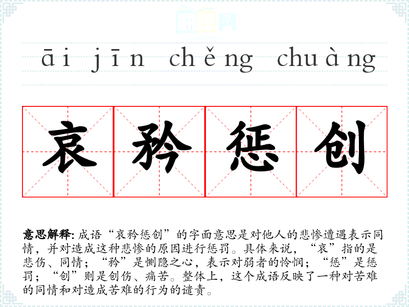 成语“哀矜惩创”的字面意思是对他人的悲惨遭遇表示同情,并对造成这种悲惨的原因进行惩罚。具体来说,“哀”指的是悲伤、同情;“矜”是恻隐之心,表示对弱者的怜悯;“惩”是惩罚;“创”则是创伤、痛苦。整体上,这个成语反映了一种对苦难的同情和对造成苦难的行为的谴责。
