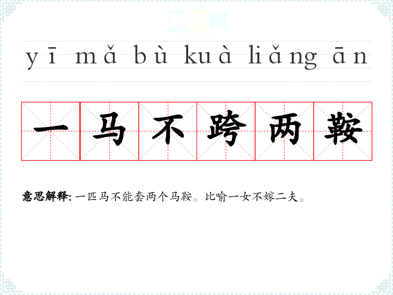鞁:通“鞴”,把鞍辔等套在马上。一匹马不套两个辔,只套一个。比喻一女不嫁二夫,即从一而终。 |