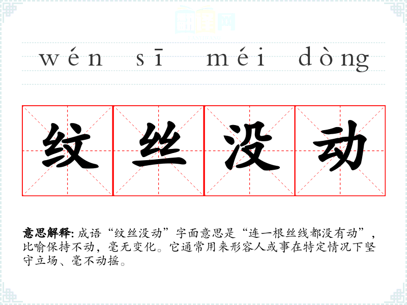 成语“纹丝没动”字面意思是“连一根丝线都没有动”,比喻保持不动,毫无变化。它通常用来形容人或事在特定情况下坚守立场、毫不动摇。