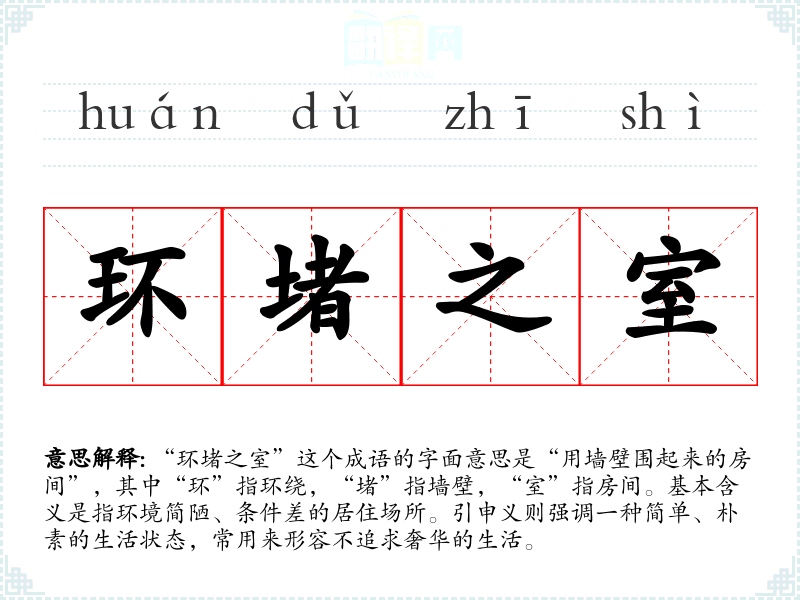 “环堵之室”这个成语的字面意思是“用墙壁围起来的房间”,其中“环”指环绕,“堵”指墙壁,“室”指房间。基本含义是指环境简陋、条件差的居住场所。引申义则强调一种简单、朴素的生活状态,常用来形容不追求奢华的生活。