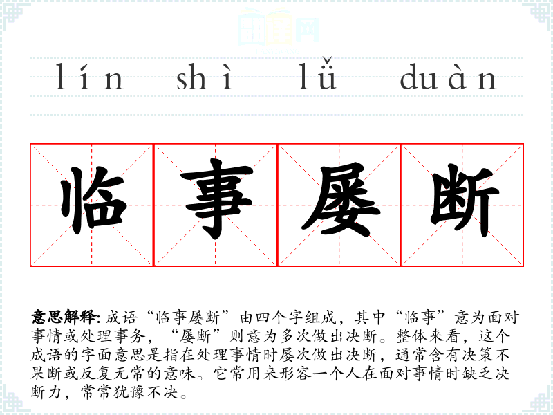 成语“临事屡断”由四个字组成,其中“临事”意为面对事情或处理事务,“屡断”则意为多次做出决断。整体来看,这个成语的字面意思是指在处理事情时屡次做出决断,通常含有决策不果断或反复无常的意味。它常用来形容一个人在面对事情时缺乏决断力,常常犹豫不决。