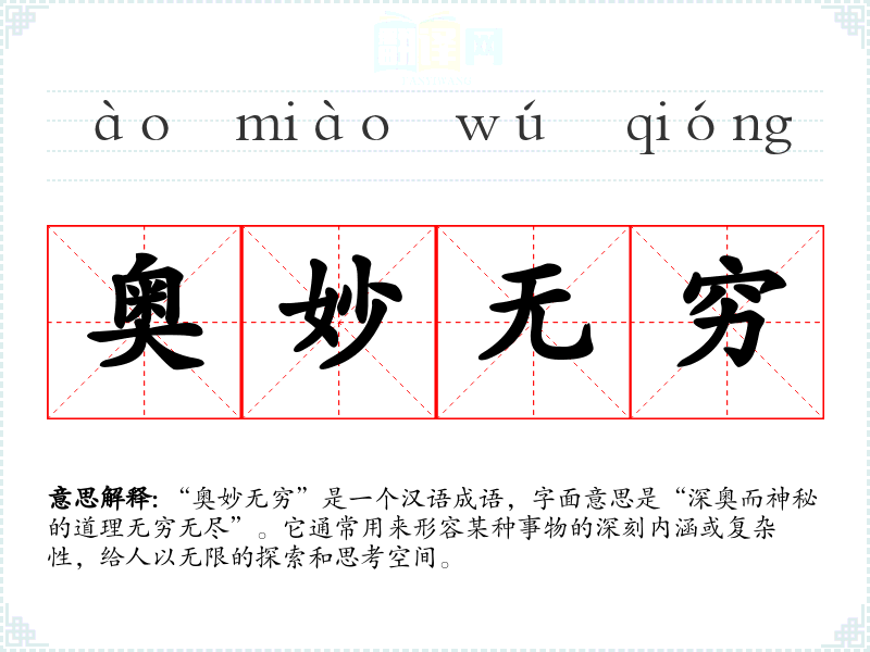 “奥妙无穷”是一个汉语成语,字面意思是“深奥而神秘的道理无穷无尽”。它通常用来形容某种事物的深刻内涵或复杂性,给人以无限的探索和思考空间。