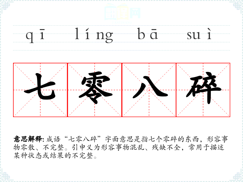| 七零八碎 | ①形容残破不堪。②零星琐碎。③指零星的物品。 |