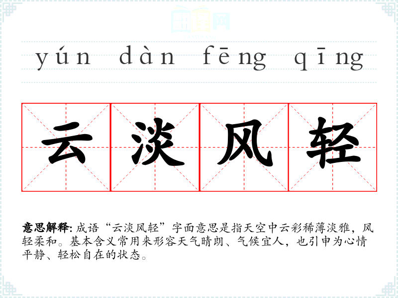 成语“云淡风轻”字面意思是指天空中云彩稀*淡雅,风轻柔和。基本含义常用来形容天气晴朗、气候宜人,也引申为心情平静、轻松自在的状态。