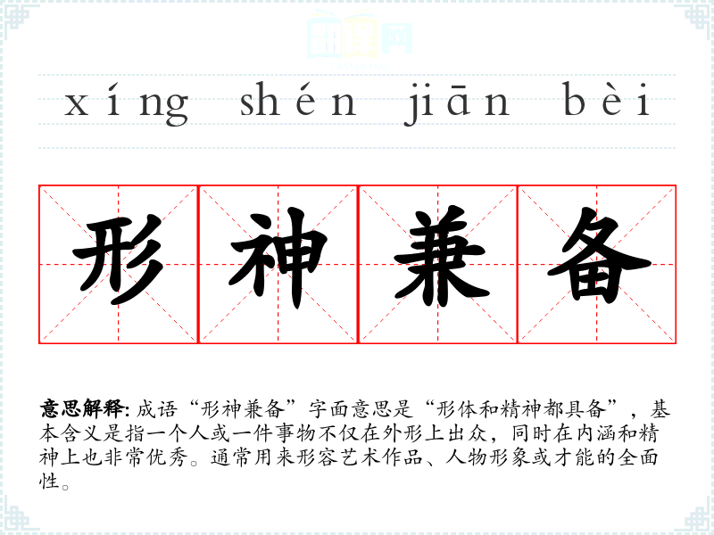 成语“形神兼备”字面意思是“形体和精神都具备”,基本含义是指一个人或一件事物不仅在外形上出众,同时在内涵和精神上也非常优秀。通常用来形容艺术作品、人物形象或才能的全面性。