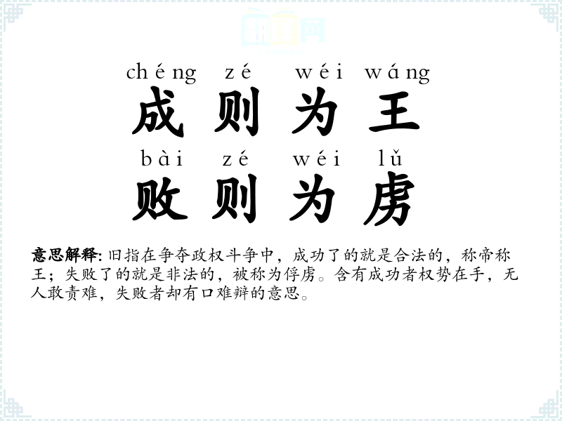 旧指在争夺政权斗争中,成功了的就是合法的,称帝称王;失败了的就是非法的,被称为俘虏。含有成功者权势在手,无人敢责难,失败者却有口难辩的意思。 |