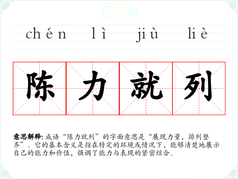 成语“陈力就列”的字面意思是“展现力量,排列整齐”。它的基本含义是指在特定的环境或情况下,能够清楚地展示自己的能力和价值,强调了能力与表现的紧密结合。