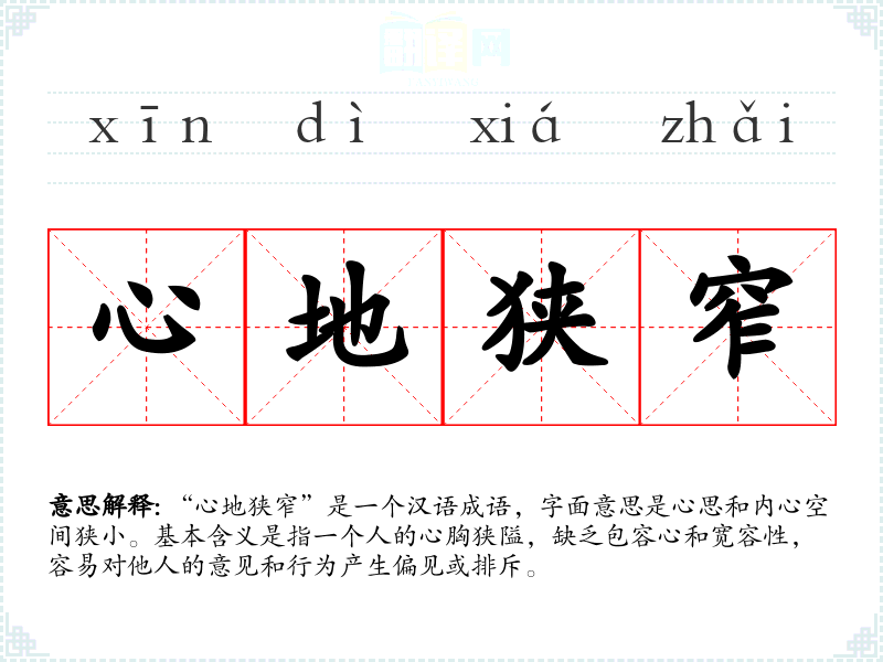 “心地狭窄”是一个汉语成语,字面意思是心思和内心空间狭小。基本含义是指一个人的心胸狭隘,缺乏包容心和宽容性,容易对他人的意见和行为产生偏见或排斥。