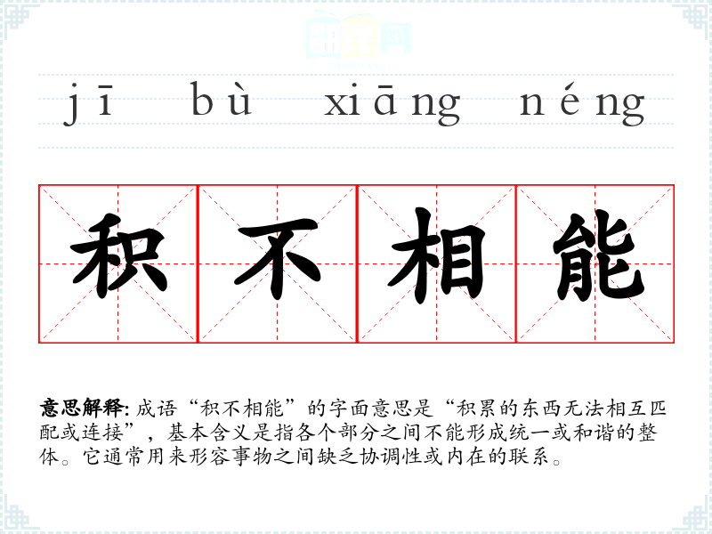 成语“积不相能”的字面意思是“积累的东西无法相互匹配或连接”,基本含义是指各个部分之间不能形成统一或和谐的整体。它通常用来形容事物之间缺乏协调性或内在的联系。