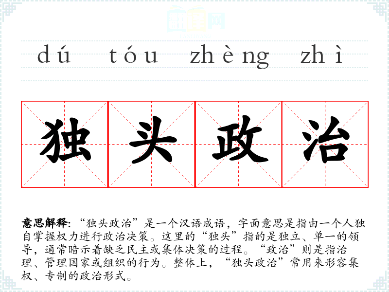 在**的历史文化背景中,“独头政治”常常与封建社会、专制统治相联系。在现代社会,随着民主理念的普及,该成语也成为批判权力集中现象的工具。它在现代政治讨论中仍然具有重要意义,尤其是在对抗腐败和推动民主改革的语境中。