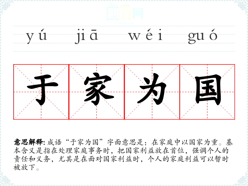 成语“于家为国”字面意思是:在家庭中以国家为重。基本含义是指在处理家庭事务时,把国家利益放在首位,强调个人的责任和义务,尤其是在面对国家利益时,个人的家庭利益可以暂时被放下。