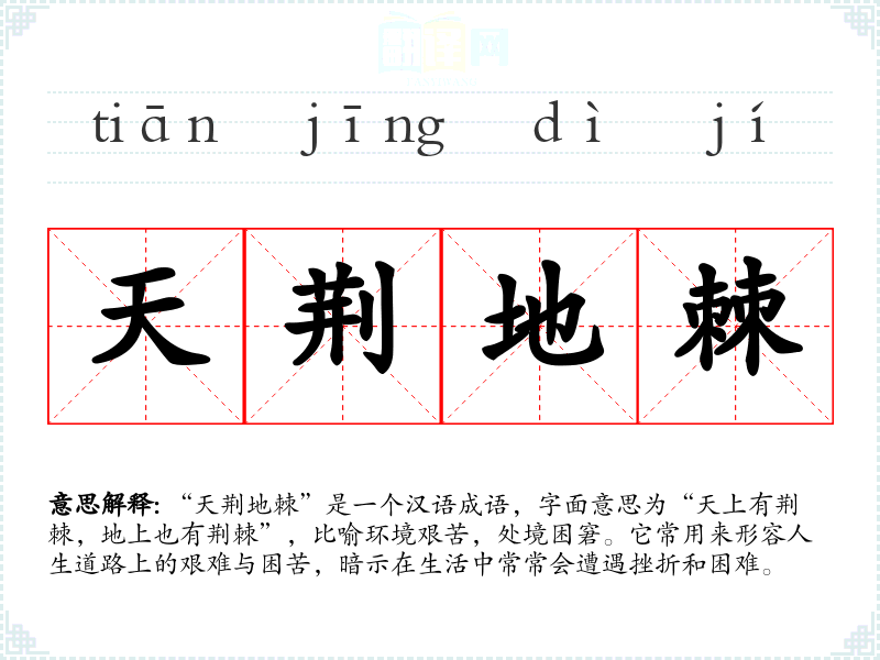 “天荆地棘”是一个汉语成语,字面意思为“天上有荆棘,地上也有荆棘”,比喻环境艰苦,处境困窘。它常用来形容人生道路上的艰难与困苦,暗示在生活中常常会遭遇挫折和困难。