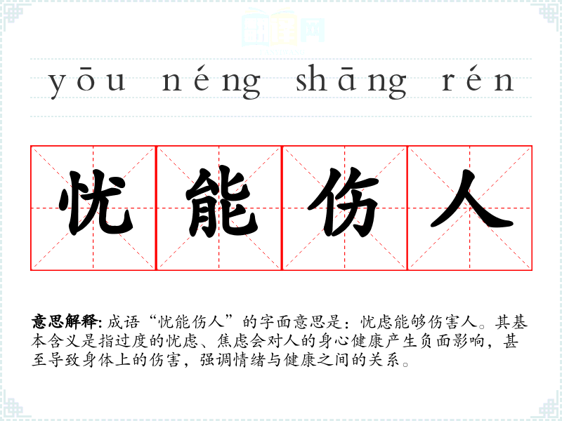 成语“忧能伤人”的字面意思是:忧虑能够伤害人。其基本含义是指过度的忧虑、焦虑会对人的身心健康产生负面影响,甚至导致身体上的伤害,强调情绪与健康之间的关系。