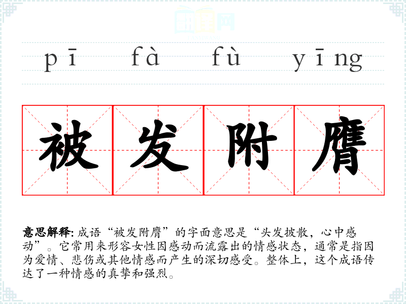 在文学作品中,“被发附膺”常用于描述女性内心世界的细腻情感,尤其在古典诗词中更为常见。在日常对话中,尤其在谈论情感话题时,这个成语也可以用来形容感动的状态。例如,在讨论一部感人的电影或小说时,可以说“这部作品让我感到被发附膺”。