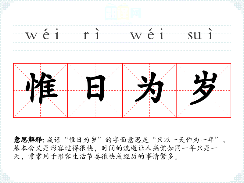成语“惟日为岁”的字面意思是“只以一天作为一年”。基本含义是形容过得很快,时间的流逝让人感觉如同一年只是一天,常常用于形容生活节奏很快或经历的事情繁多。