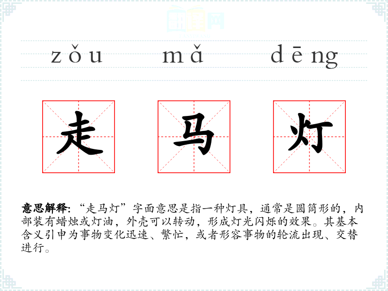 “走马灯”字面意思是指一种灯具,通常是圆筒形的,内部装有蜡烛或灯油,外壳可以转动,形成灯光闪烁的效果。其基本含义引申为事物变化迅速、繁忙,或者形容事物的轮流出现、交替进行。