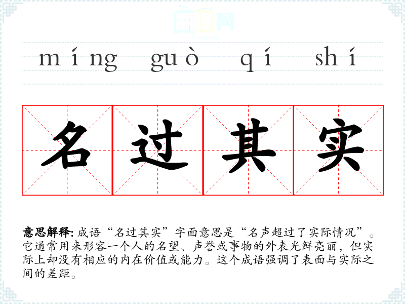 成语“名过其实”字面意思是“名声超过了实际情况”。它通常用来形容一个人的名望、声誉或事物的外表光鲜亮丽,但实际上却没有相应的内在价值或能力。这个成语强调了表面与实际之间的差距。