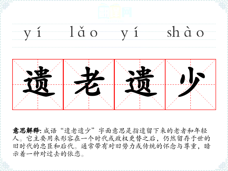 成语“遗老遗少”字面意思是指遗留下来的老者和年轻人。它主要用来形容在一个时代或政权更替之后,仍然留存于世的旧时代的忠臣和后代。通常带有对旧势力或传统的怀念与尊重,暗示着一种对过去的依恋。