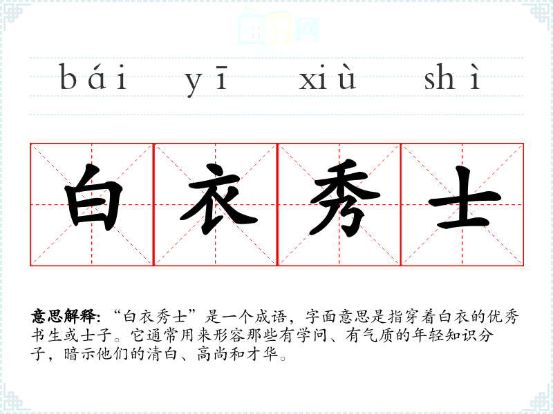 “白衣秀士”是一个成语,字面意思是指穿着白衣的优秀书生或士子。它通常用来形容那些有学问、有气质的年轻知识分子,暗示他们的清白、高尚和才华。