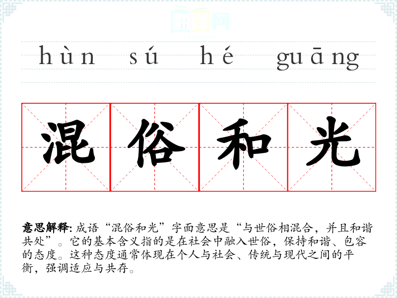 成语“混俗和光”字面意思是“与世俗相混合,并且和谐共处”。它的基本含义指的是在社会中融入世俗,保持和谐、包容的态度。这种态度通常体现在个人与社会、传统与现代之间的平衡,强调适应与共存。