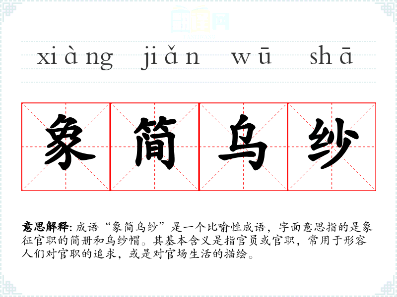 成语“象简乌纱”是一个比喻性成语,字面意思指的是象征官职的简册和乌纱帽。其基本含义是指官员或官职,常用于形容人们对官职的追求,或是对官场生活的描绘。