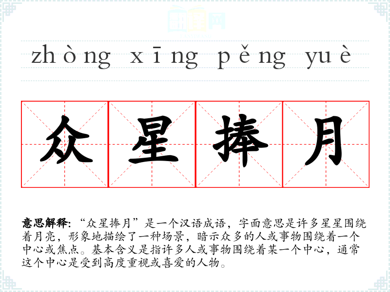 “众星捧月”是一个汉语成语,字面意思是许多星星围绕着月亮,形象地描绘了一种场景,暗示众多的人或事物围绕着一个中心或焦点。基本含义是指许多人或事物围绕着某一个中心,通常这个中心是受到高度重视或喜爱的人物。