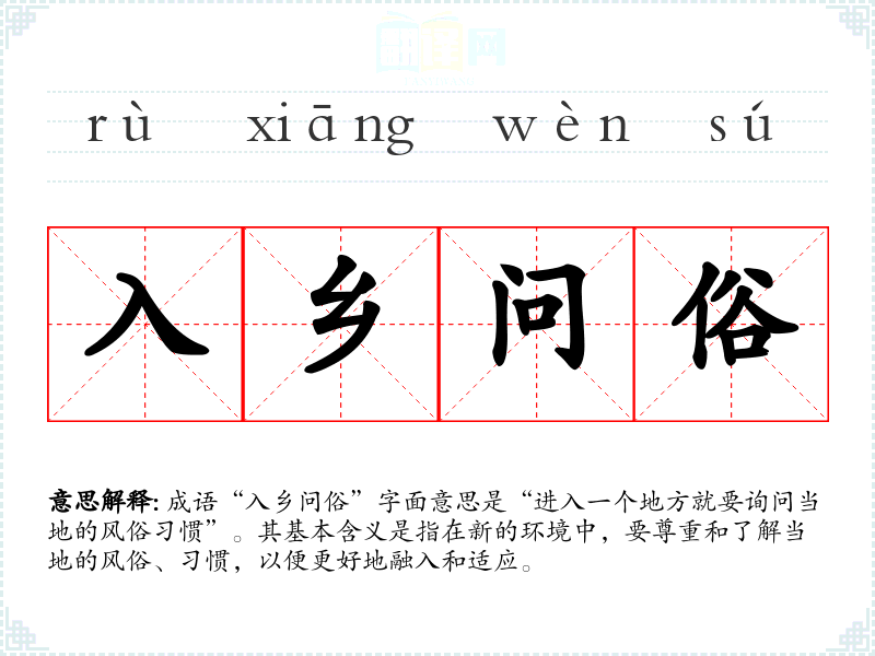成语“入乡问俗”字面意思是“进入一个地方就要询问当地的风俗惯”。其基本含义是指在新的环境中,要尊重和了解当地的风俗、惯,以便更好地融入和适应。