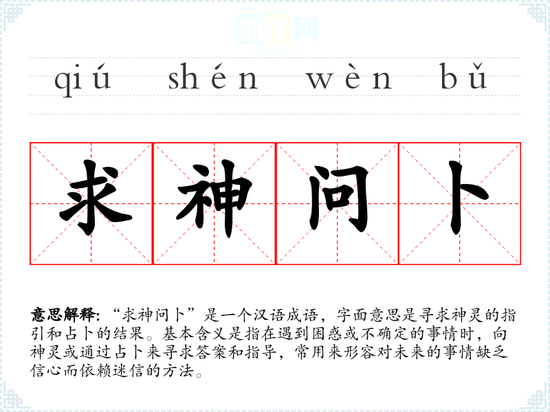 “求神问卜”是一个汉语成语,字面意思是寻求神灵的指引和占卜的结果。基本含义是指在遇到困惑或不确定的事情时,向神灵或通过占卜来寻求答案和指导,常用来形容对未来的事情缺乏信心而依赖迷信的方法。
