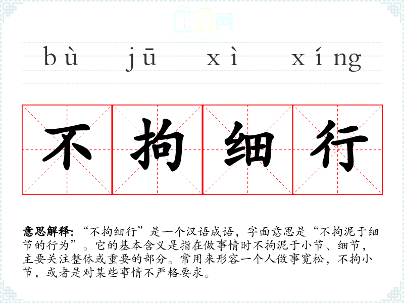 “不拘细行”是一个汉语成语,字面意思是“不拘泥于细节的行为”。它的基本含义是指在做事情时不拘泥于小节、细节,主要关注整体或重要的部分。常用来形容一个人做事宽松,不拘小节,或者是对某些事情不严格要求。