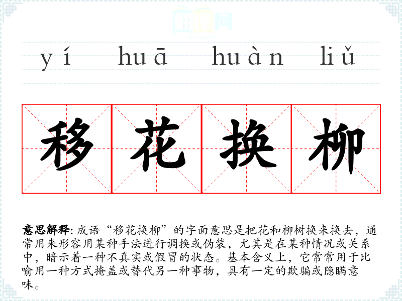成语“移花换柳”的字面意思是把花和柳树换来换去,通常用来形容用某种手法进行调换或伪装,尤其是在某种情况或关系中,暗示着一种不真实或假冒的状态。基本含义上,它常常用于比喻用一种方式掩盖或替代另一种事物,具有一定的欺骗或隐瞒意味。
