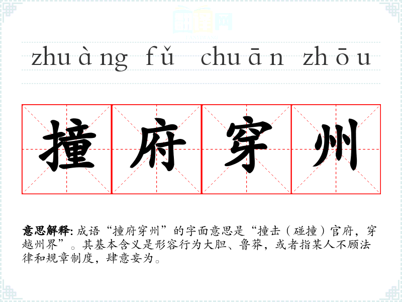 成语“撞府穿州”的字面意思是“撞击(碰撞)官府,穿越州界”。其基本含义是形容行为大胆、鲁莽,或者指某人不顾法律和规章制度,肆意妄为。